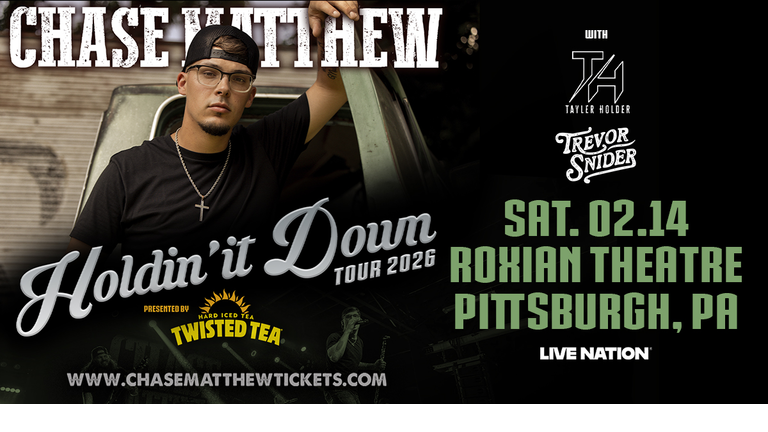 Chase Matthew - Holdin' it Down Tour 2026 Sat • Feb 14, 2026 • 7:00 PM Roxian Theatre Presented By Citizens McKees Rocks, PA Additional Info DOORS: 7:00 PM SHOW: 8:00 PM ALL AGES SHOW BUY TICKETS NOW
