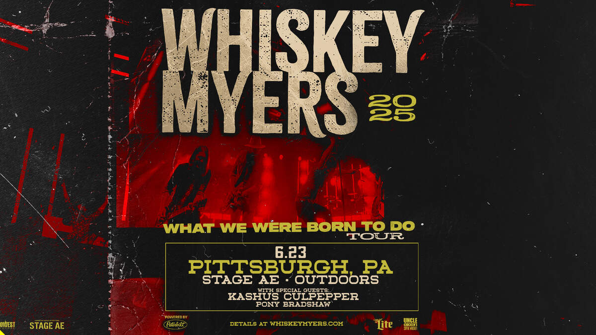 Whiskey Myers - What We Were Born To Do Tour 2025 Whiskey Myers, Kashus Culpepper, Pony Bradshaw Stage AE Pittsburgh, PA June 23 Monday 5:00PM Doors Open Outdoors – Rain or Shine On Sale Friday 2/28 All Ages BUY TICKETS NOW