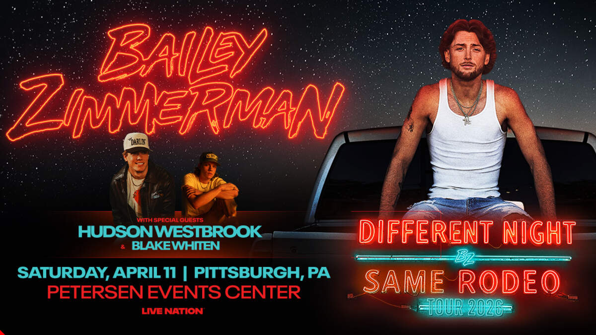 Today, multi-platinum country superstar Bailey Zimmerman is thrilled to announce the dates for his 2026 Different Night Same Rodeo Tour, which includes a stop at Petersen Events Center in Pittsburgh, PA, on Saturday, April 11, 2026. Following his sold-out headline trek for his New To Country Tour, Zimmerman will continue to electrify audiences as he brings his dynamic live show to more than 30 venues across the US and Canada, promoted by Live Nation, and featuring support from Hudson Westbrook and Blake Whiten.